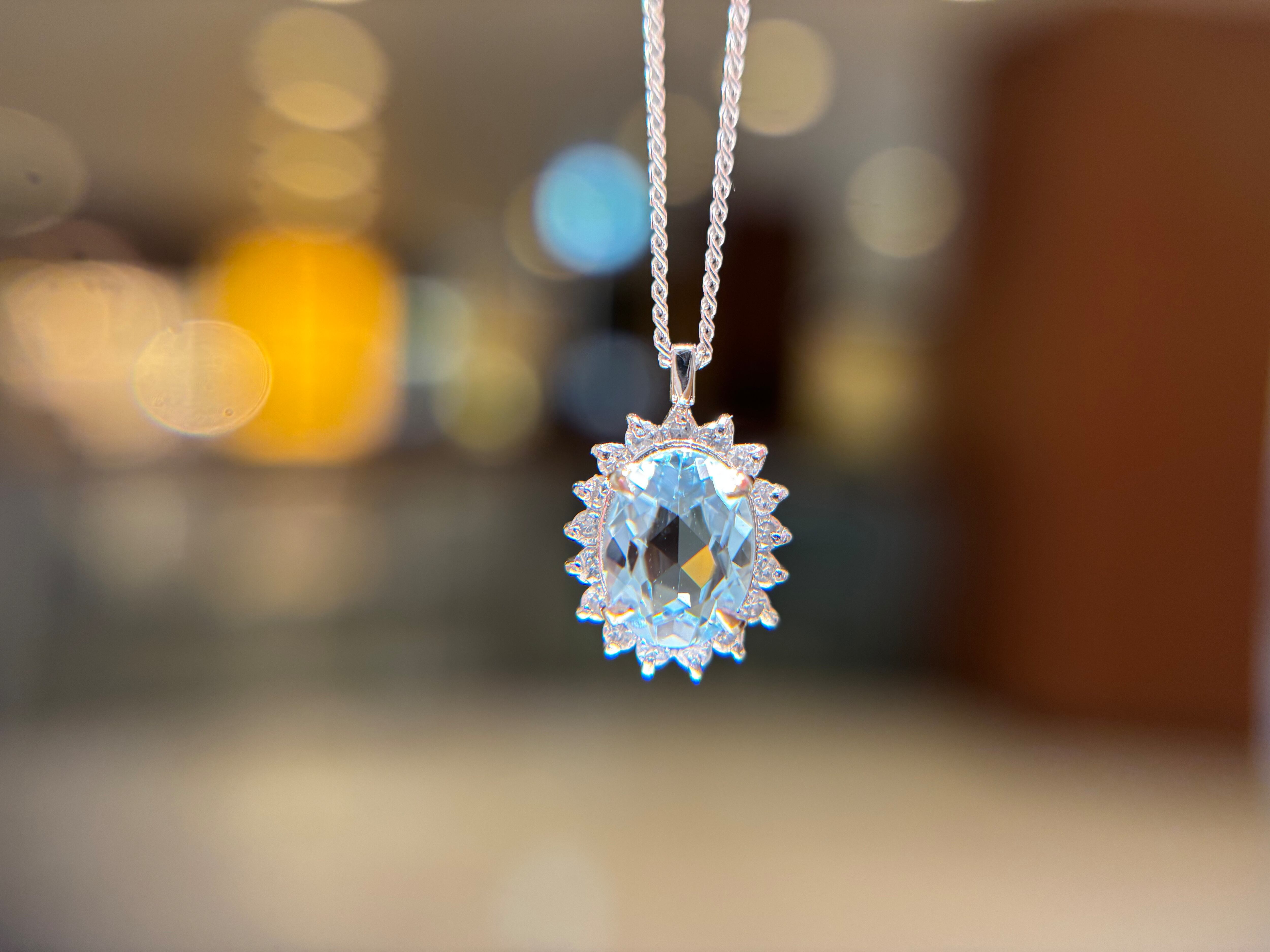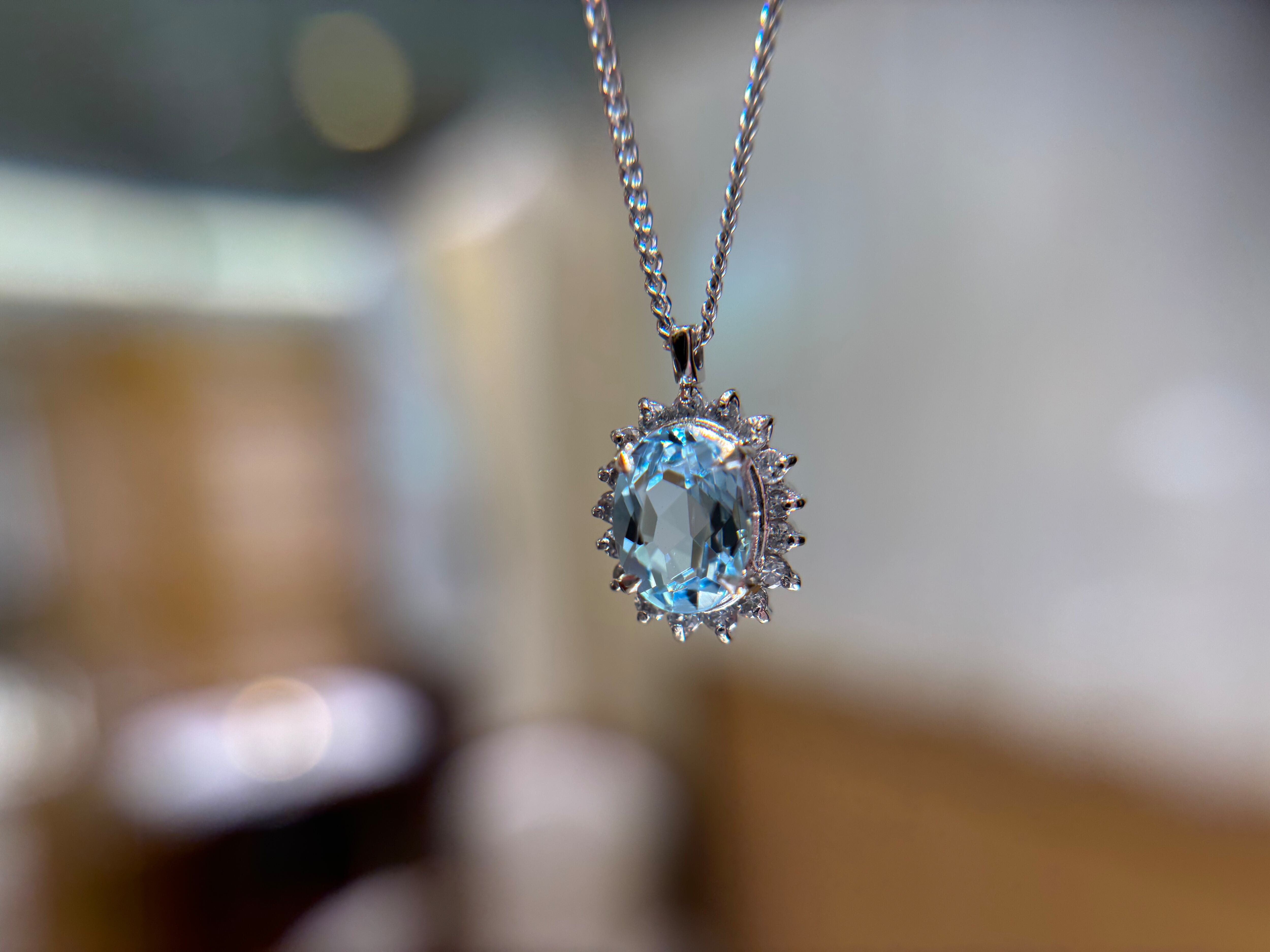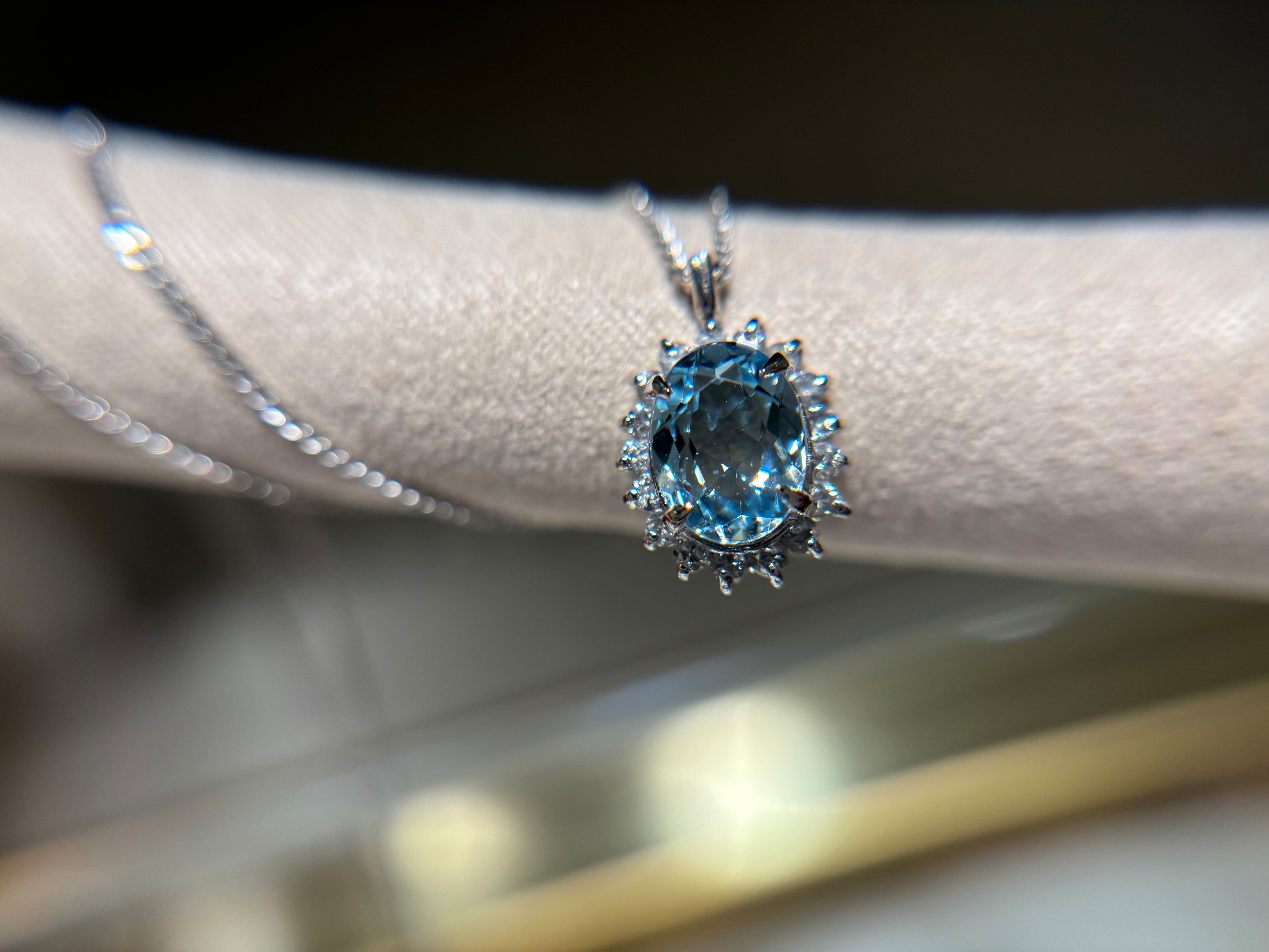 爽やかなカラーが印象的な「アクアマリン」その周囲を太陽フレアのようセットされたダイヤモンドが煌めき、また動きがあるデザインは胸元を明るく見せます。アクアマリンはベリル鉱物、ベリル系は独特の発色をし、直接的な光が当たるよりかは間接的な方がむしろその宝石の良さを発揮します。こちらのアクアマリンも一淡く見えますが、実はしっかりと瑞々しいアクアマリンをお楽しみいただけます。