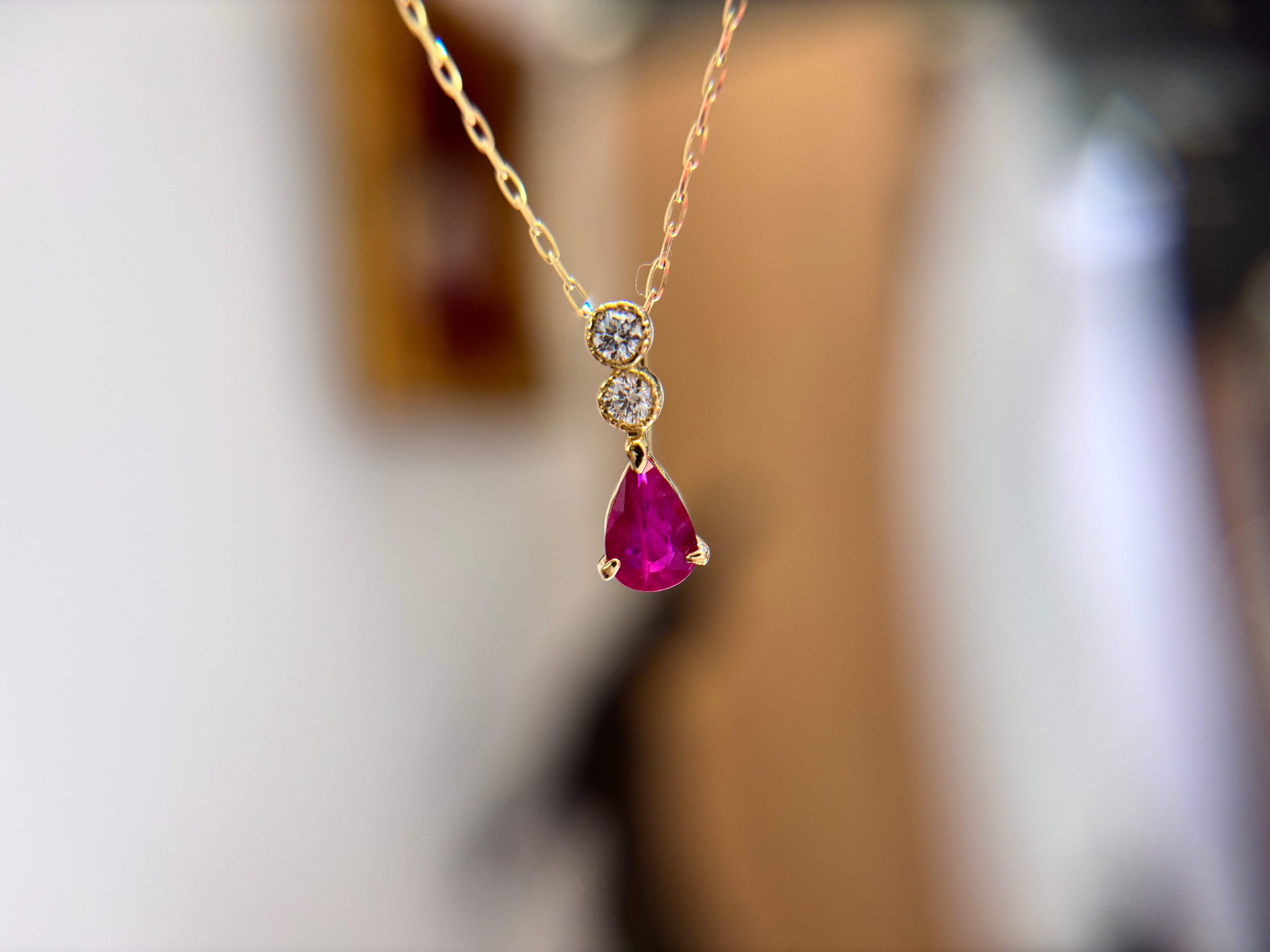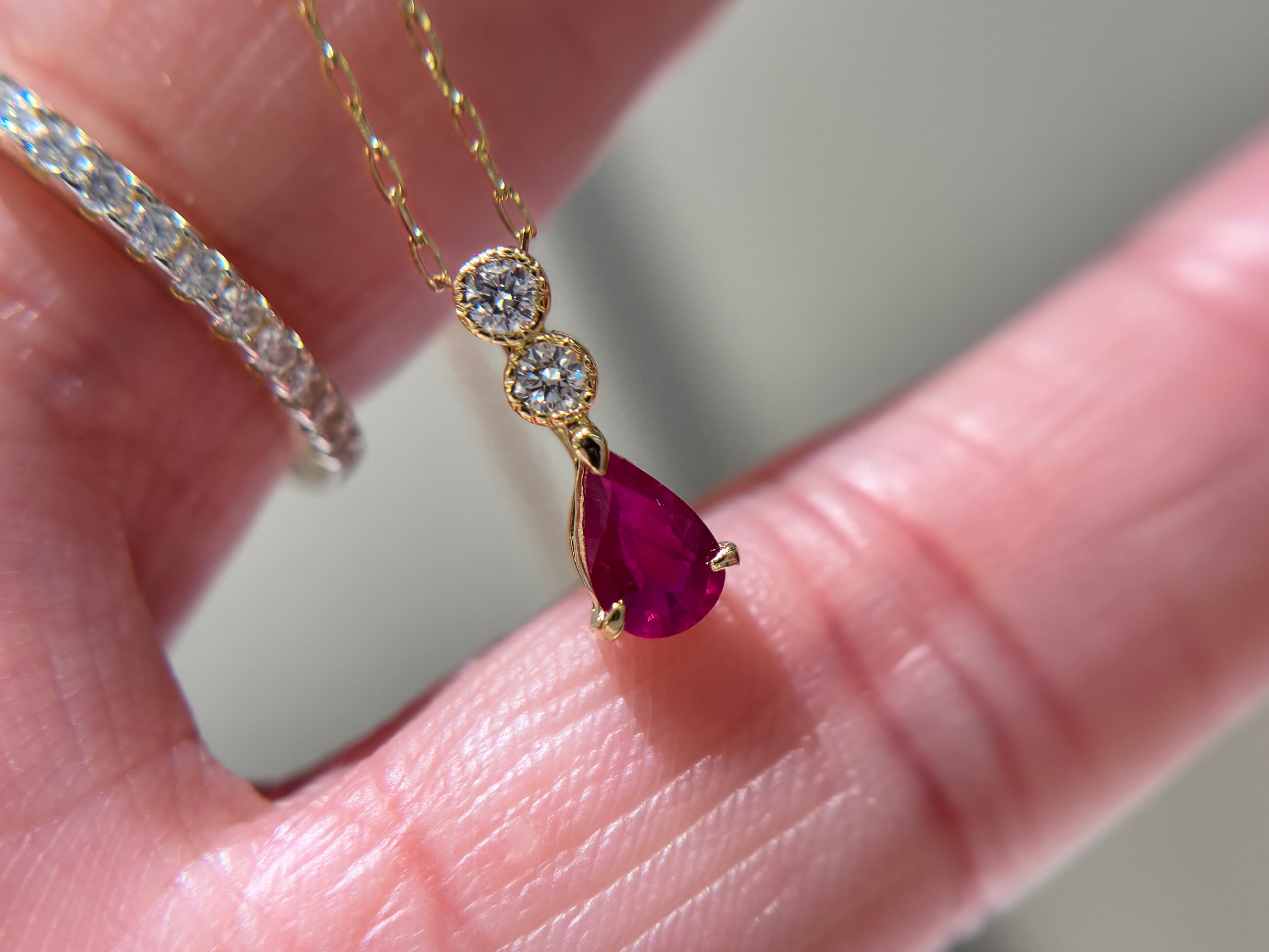 華やかな赤いルビー、ペアシェイプのシルエットがシンプルに引き立てます。