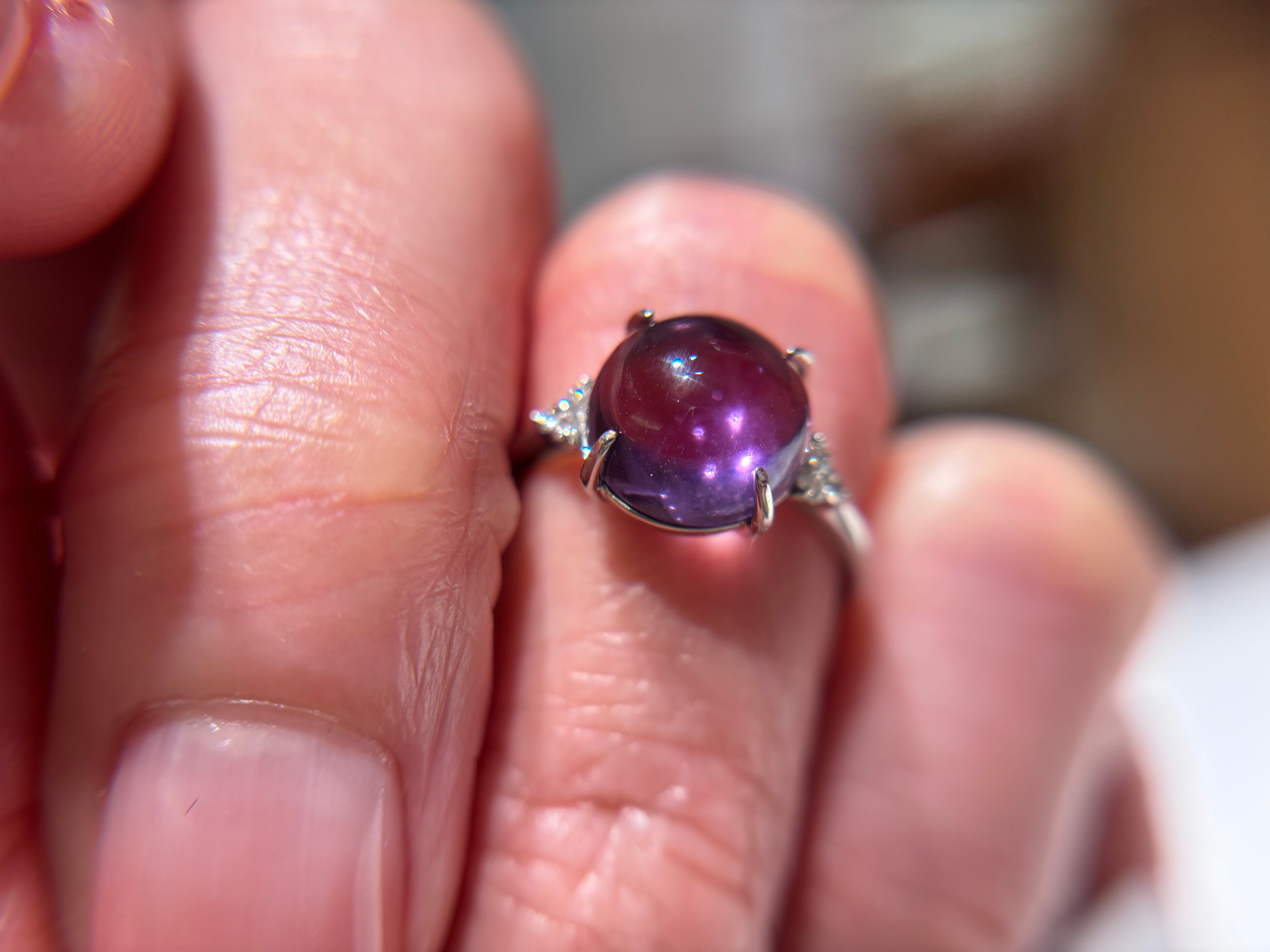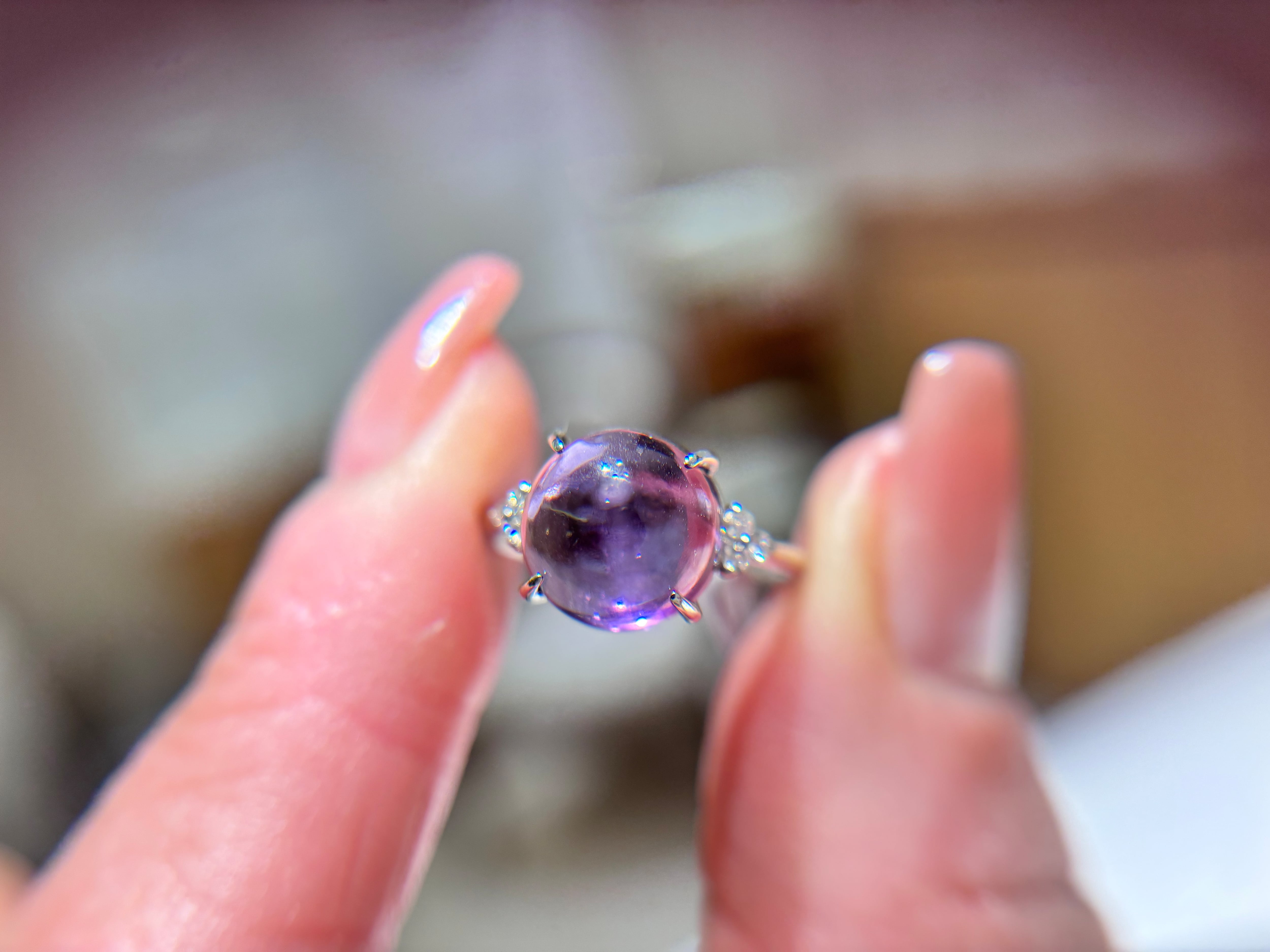 まるでキャンディのような、コロンとした大きさ。光の角度でアメジストのパープルの濃淡をお楽しみいただけます。
