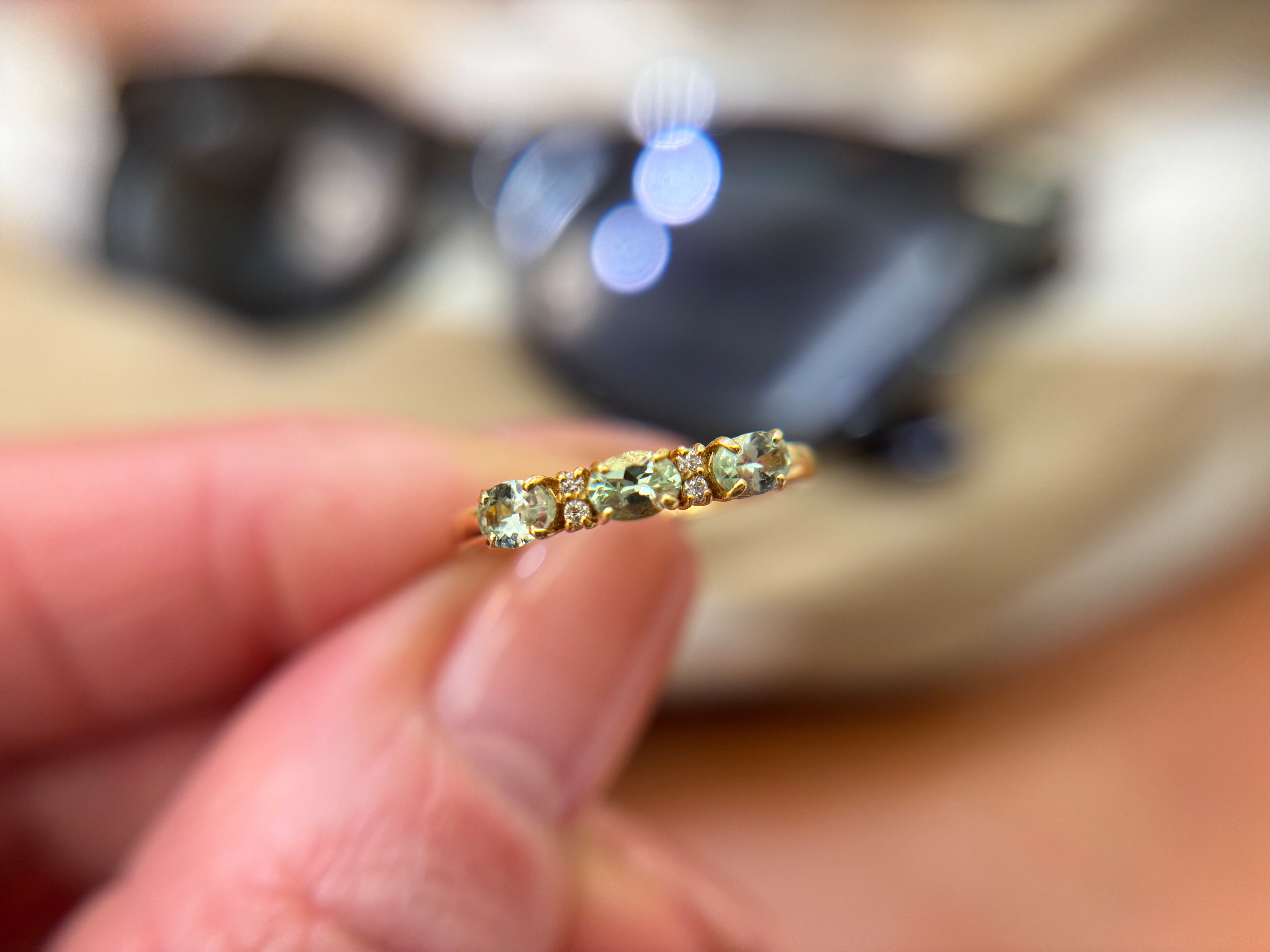 ガーネットにはさまざまな色合いがあり3石並んだ淡いミントグリーンが目を惹きます。