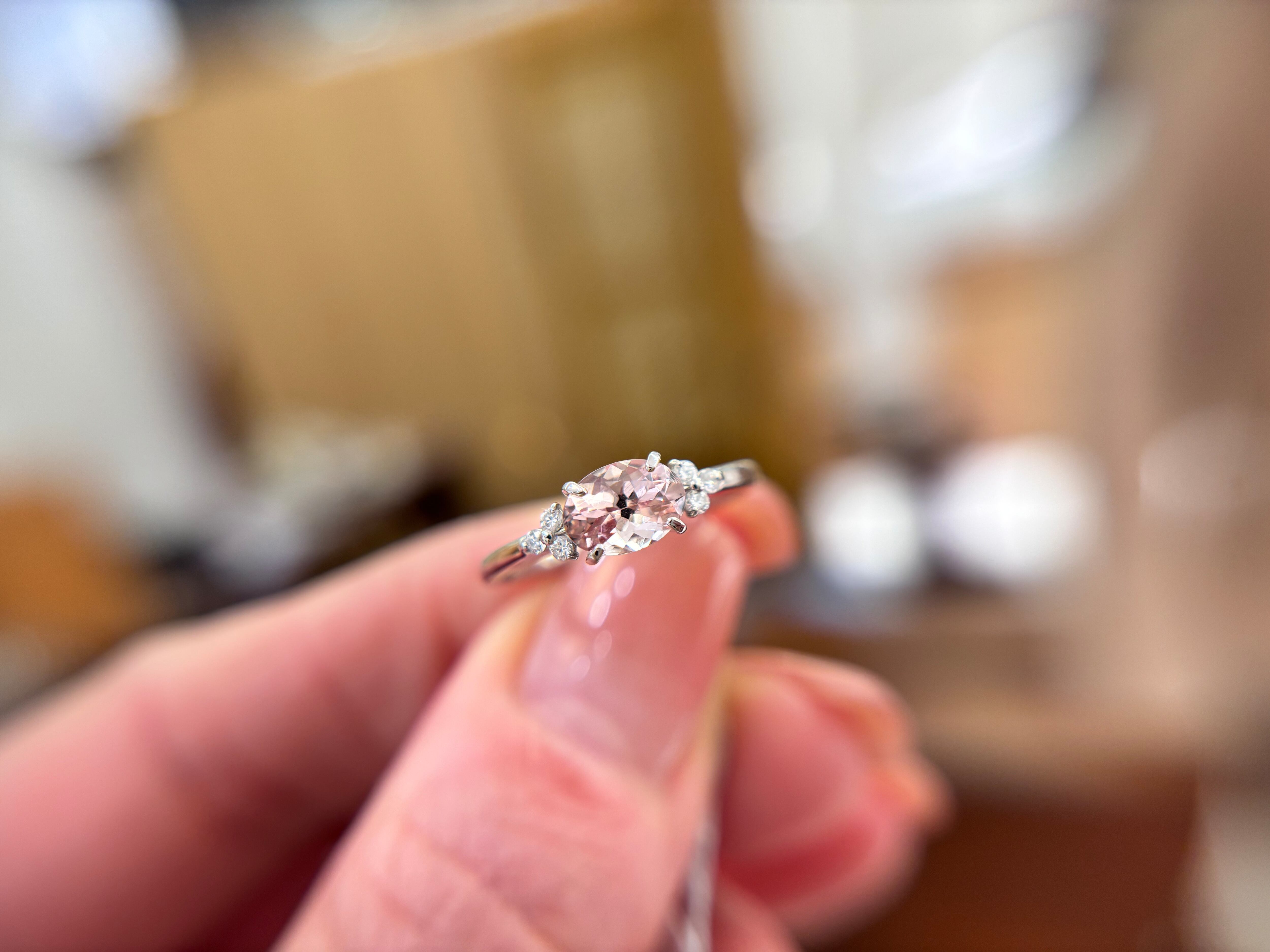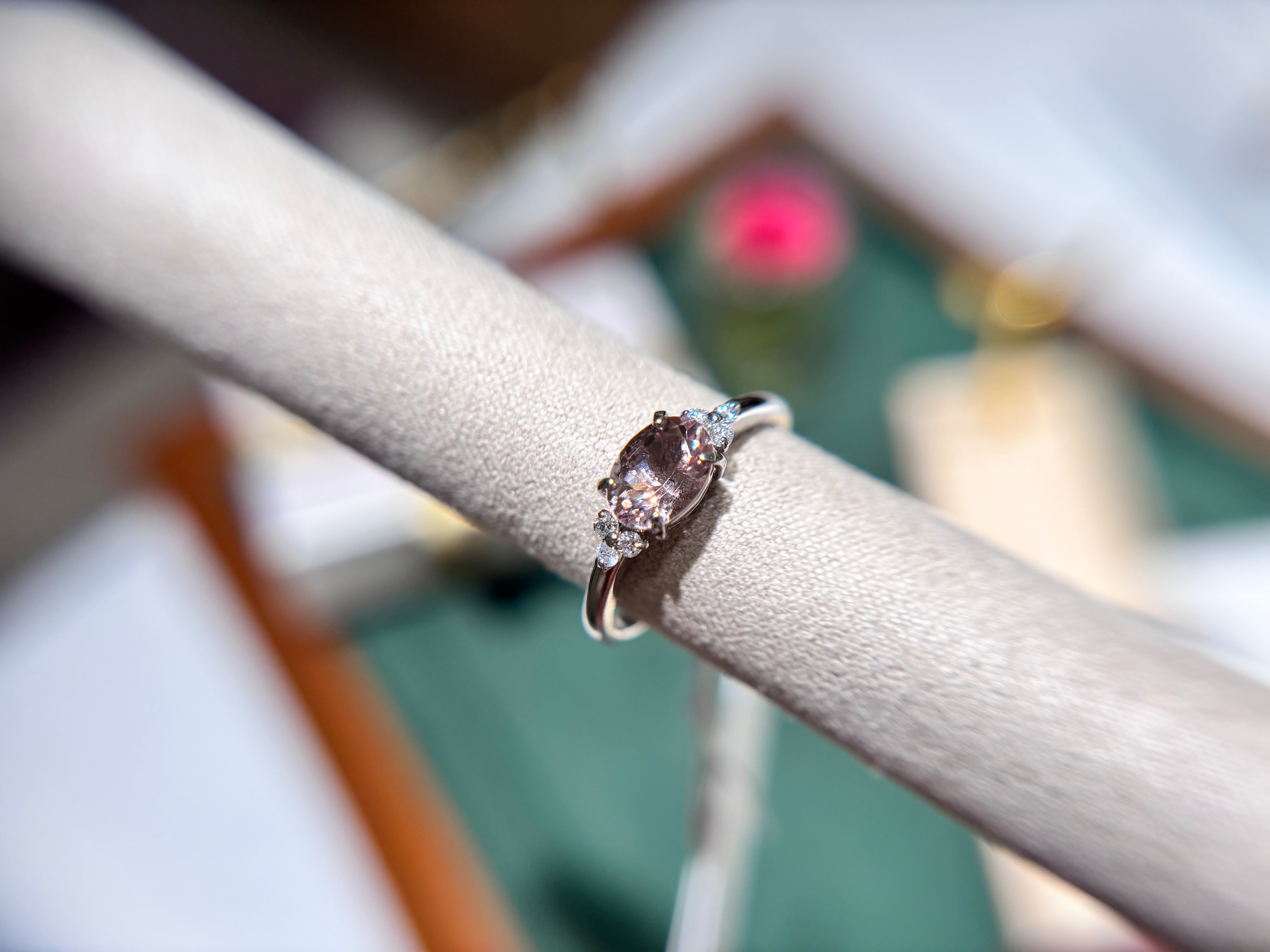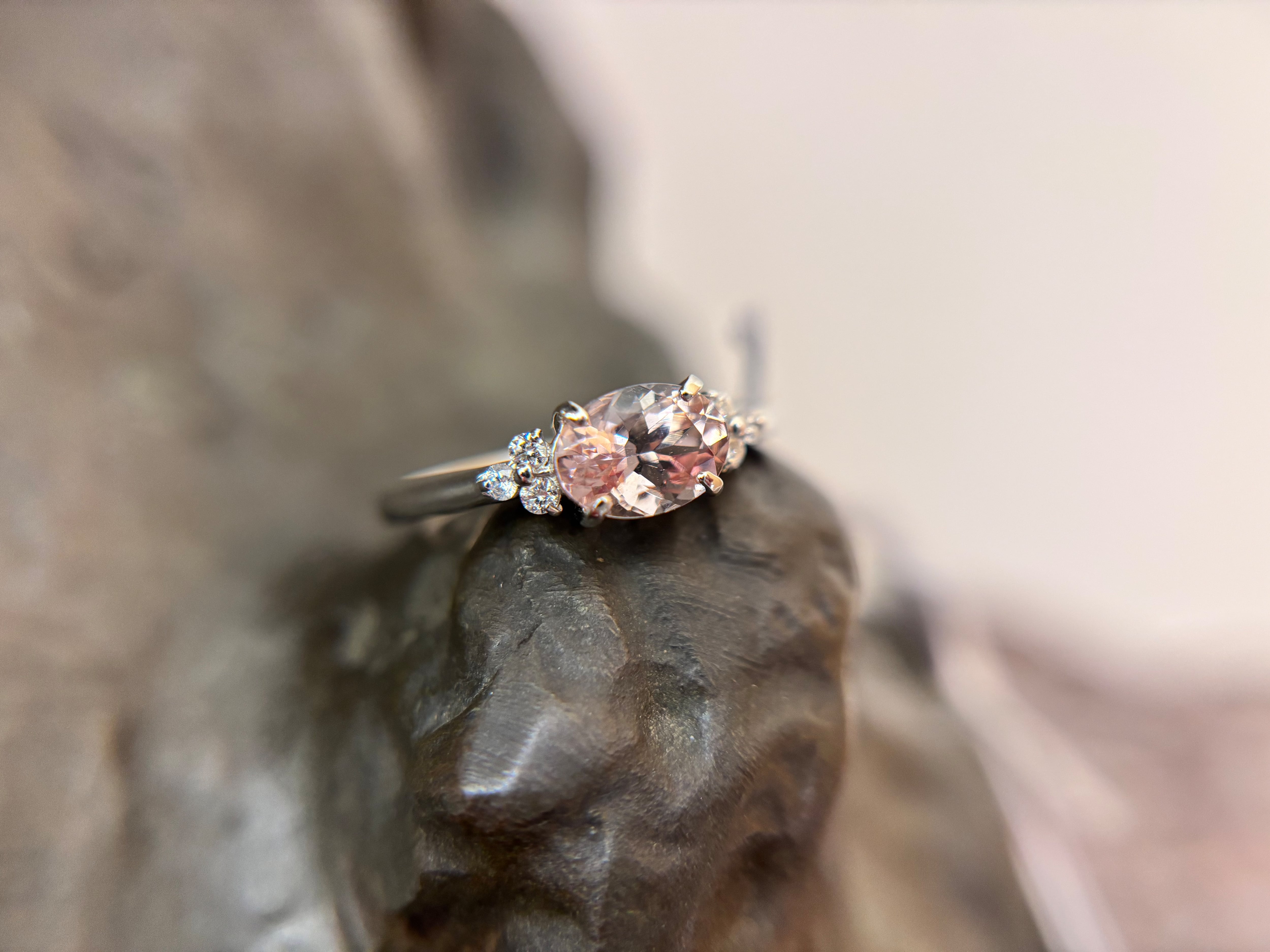 0.85カラットのオーバルカットを横使いすることで贅沢なモルガナイトの大きさを実感でき、眺めているだけで優しさを感じ、心も明るくあっという間に時間が経ってしまいそうです。