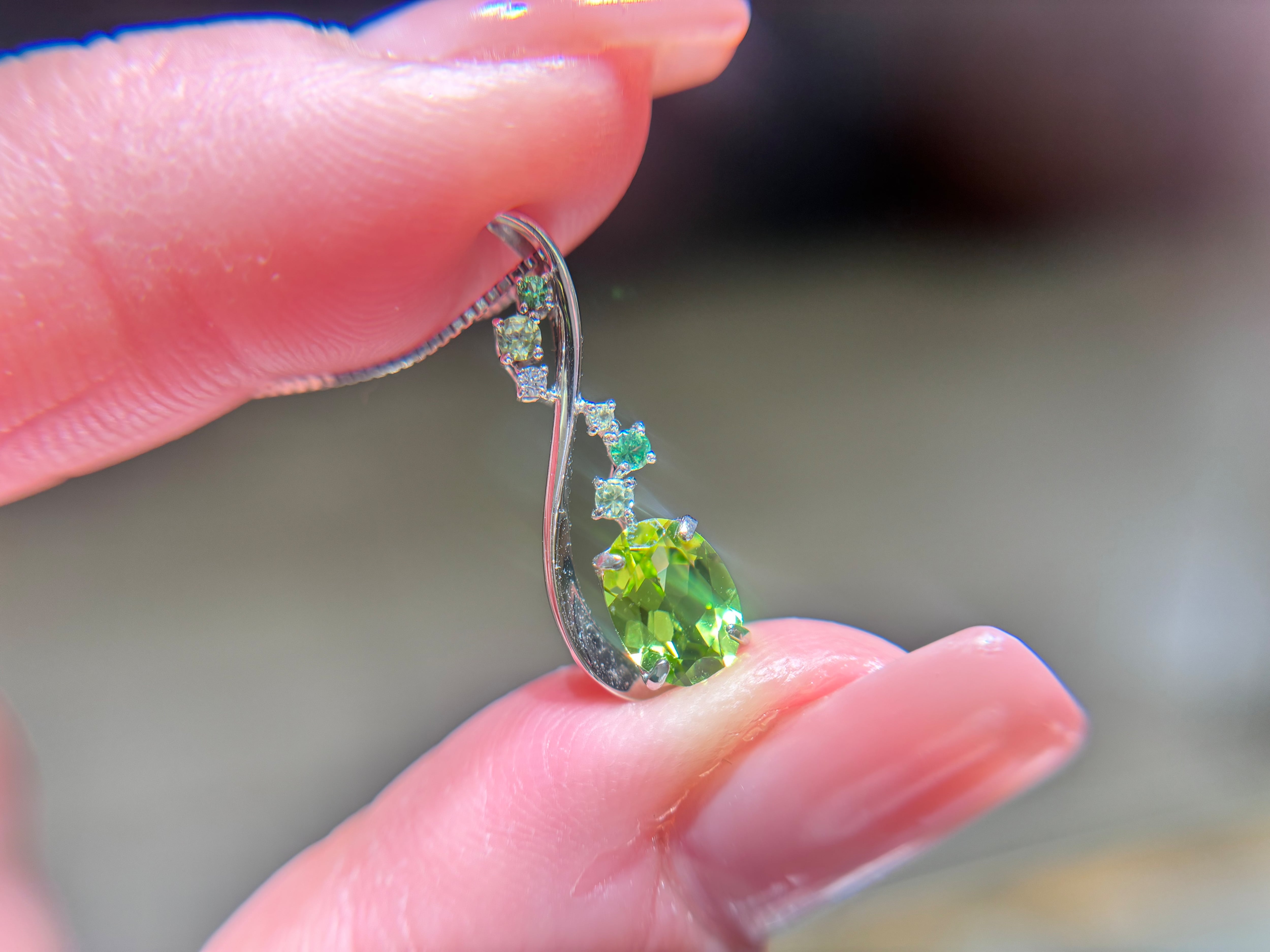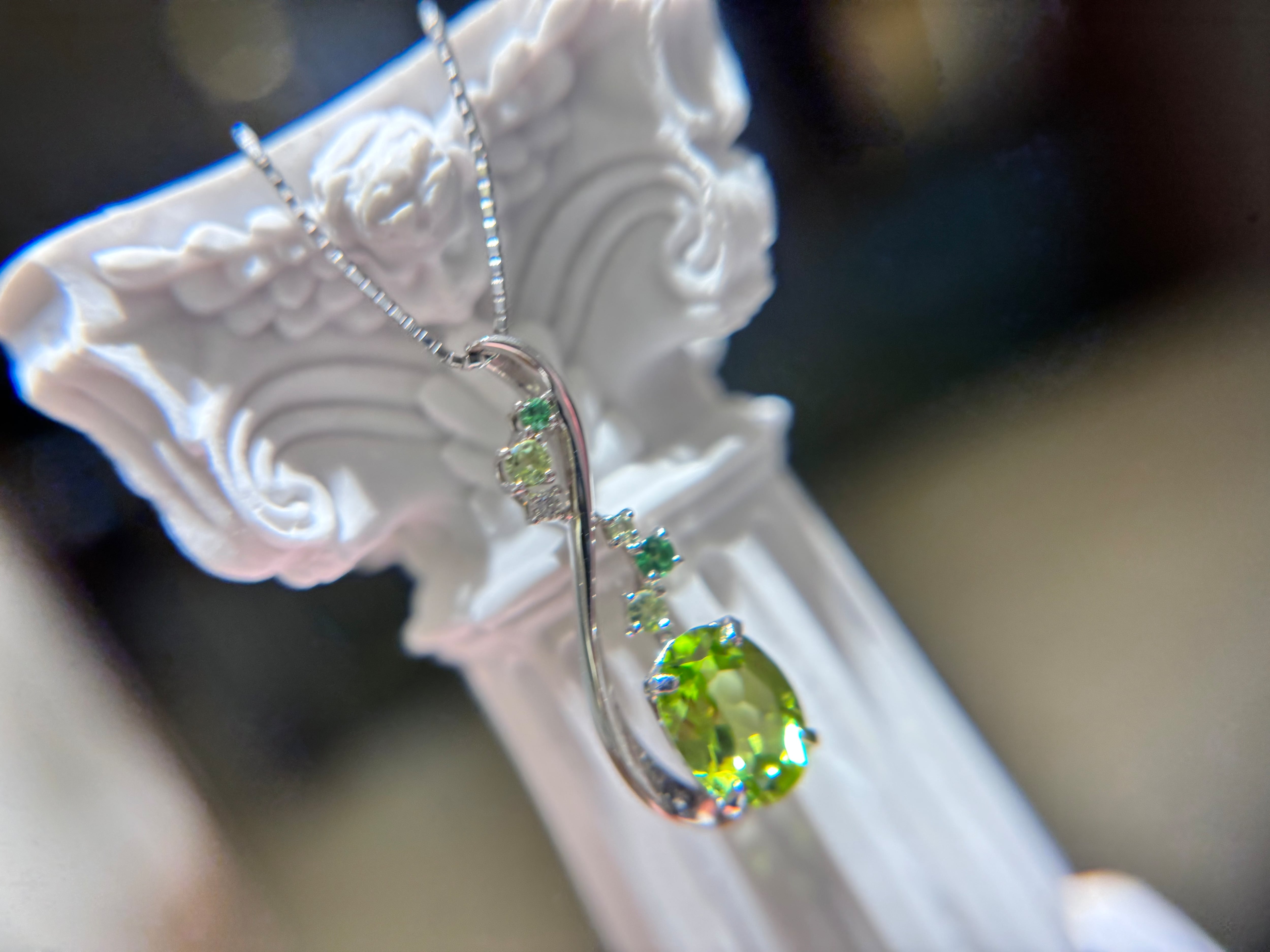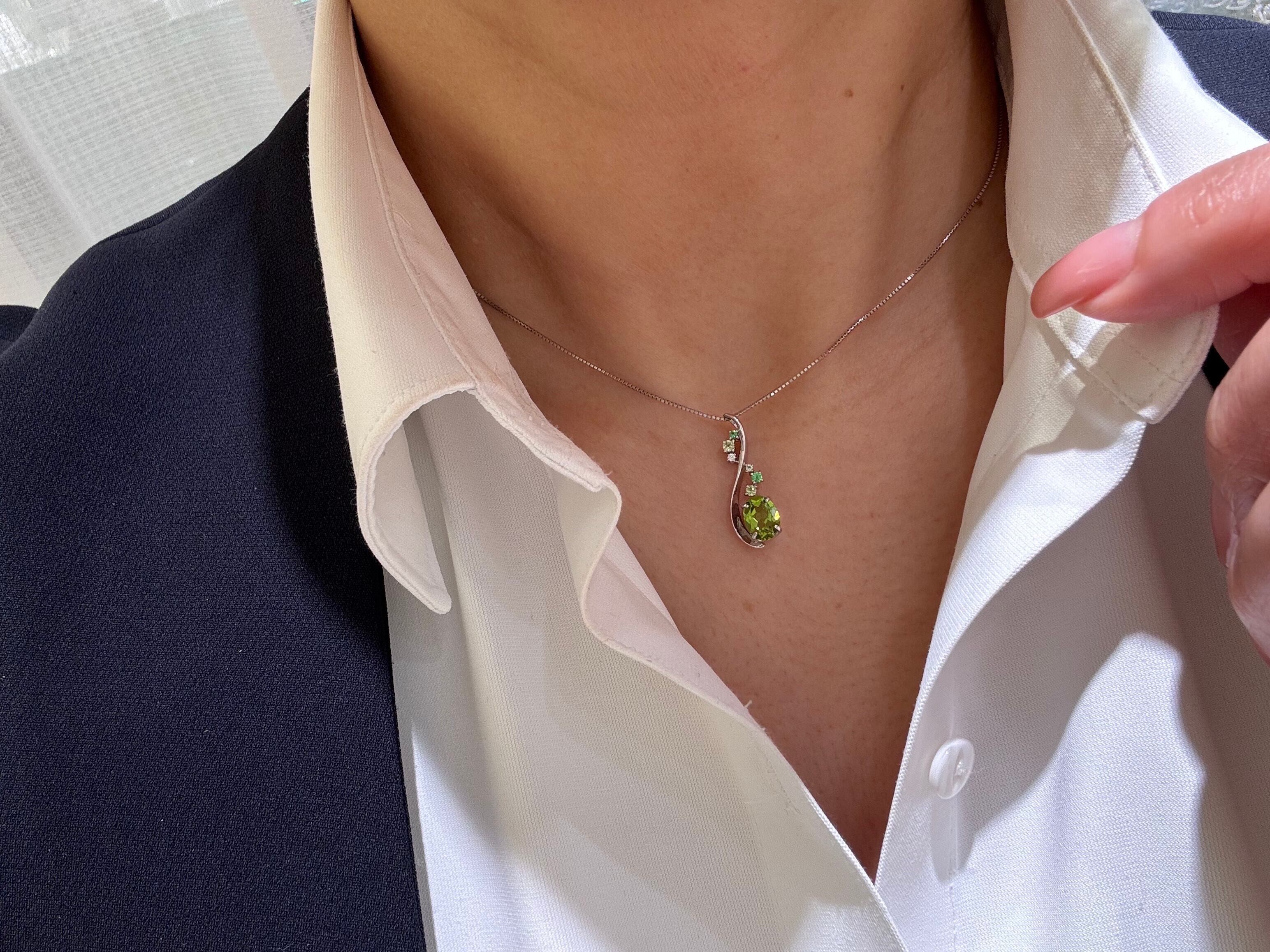 おしゃれなデザインが特徴的で、オリーブグリーンのペリドットがあなたの胸元を優雅に飾ります。その曲線を描く縦長のペンダントは、シンプルながらも個性的で、どんなコーディネートにもぴったりハマります。