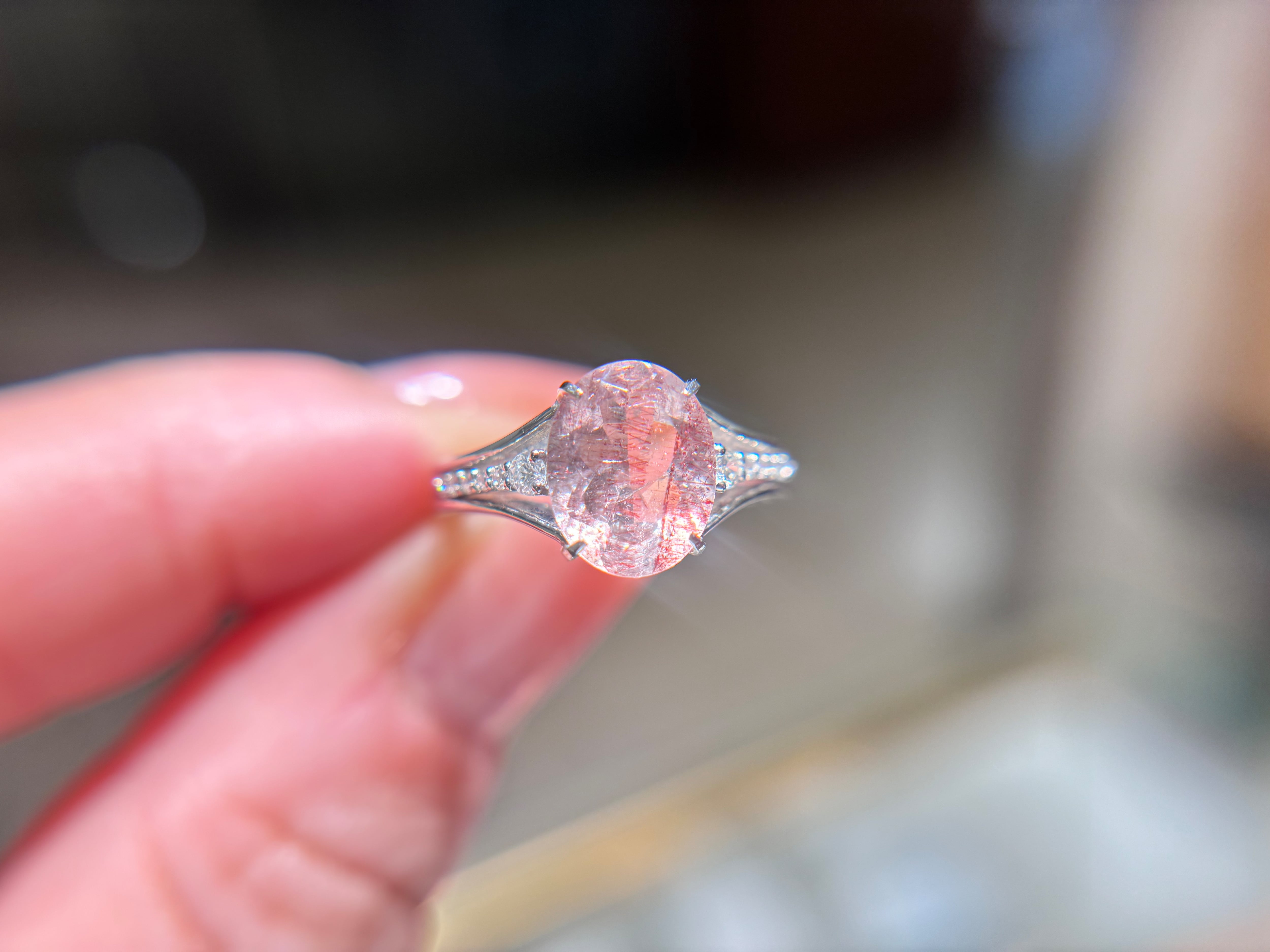 このリングは、透明感あふれるクオーツの中にゲーサイトとレピドの結晶が内包され、まるで自然のアートのような魅力を放っています。一つ一つ異なる内包物が、あなたの個性を引き立てる特別なジュエリーです。